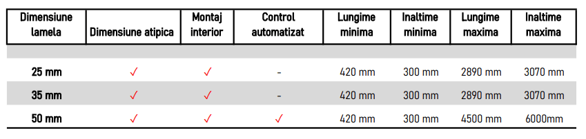 Jaluzelele realizate din lemn exotic sunt disponibile cu lamele de 50mm, 35mm și 25mm, pentru a se potrivi diverselor dimensiuni ale ferestrelor și preferințelor. Lățimea minimă a produsului este de 420 mm iar maxim 4500 mm.
